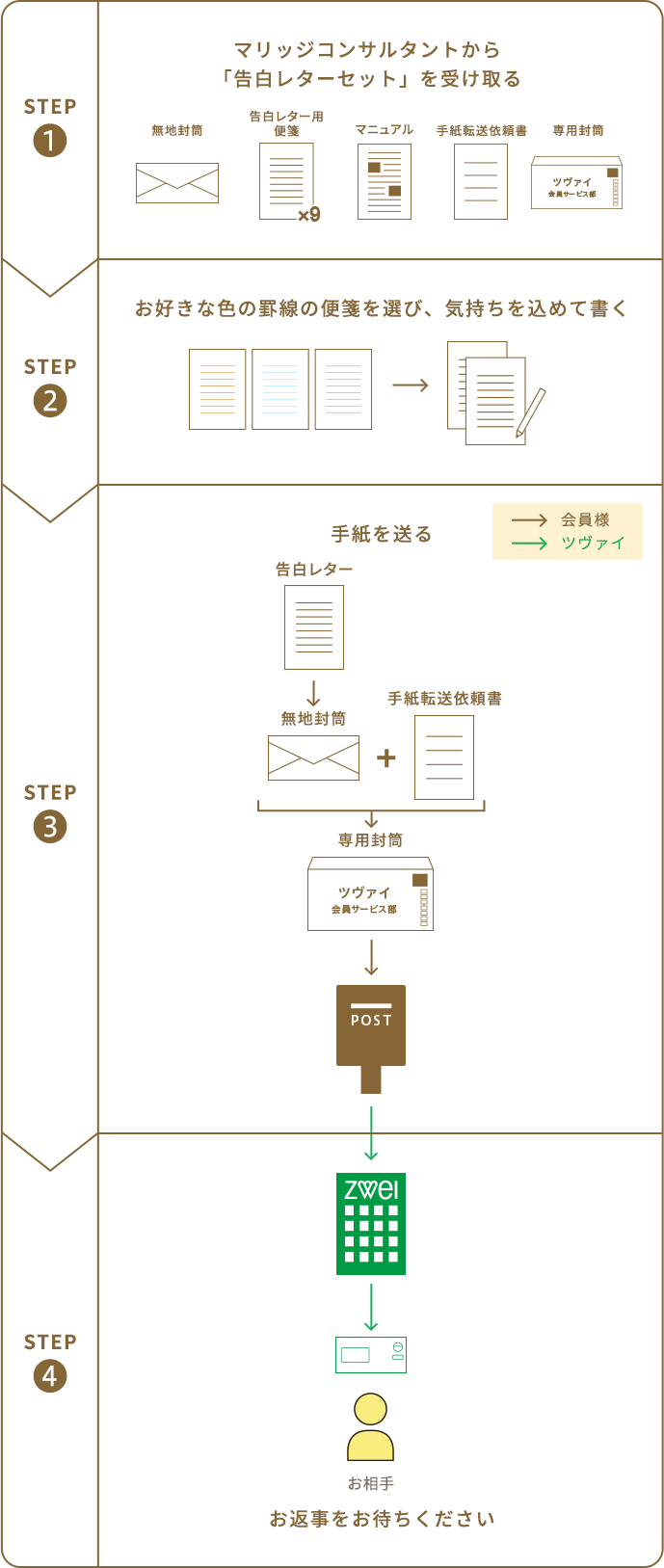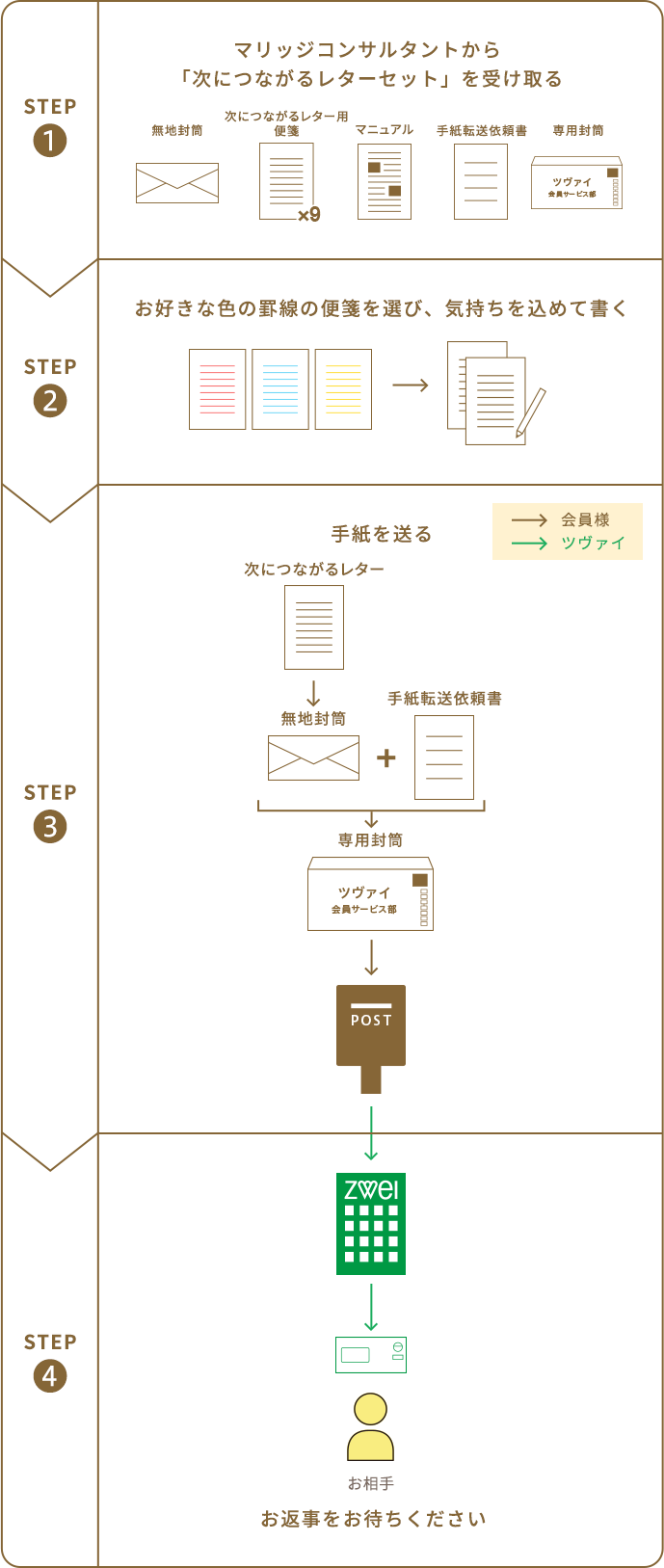 お手紙がツヴァイに届いたら、お相手の方に郵送いたします。